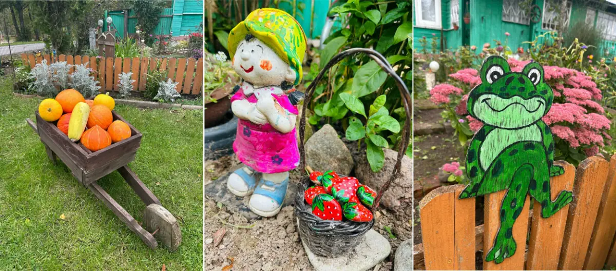 Если вы гуляли по Ильинскому парку, то не могли не заметить ухоженный домик с очень интересным участком. Небольшая, аккуратно подстриженная лужайка привлекает глаз не только прибранностью, но и разнообразными изделиями и фигурками. На пеньке — самоварчик с красивой кружечкой. В центре сада — тачка с яркими тыквами. У забора — калоша, в которой поселился красивый цветок, и много всего другого.