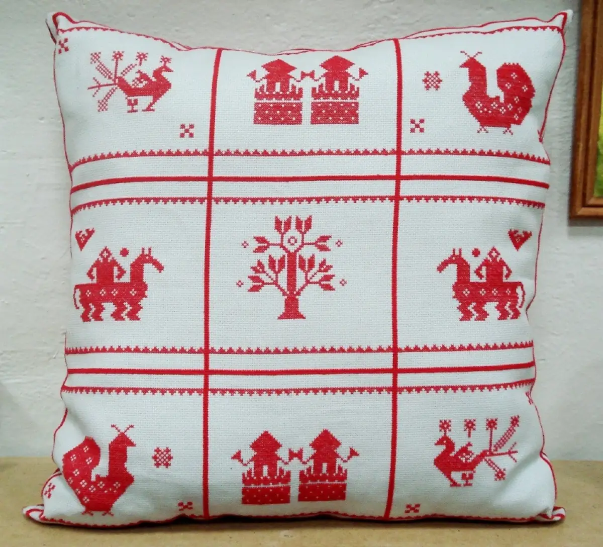 Особое место в её творчестве занимает вышивка крестом, которой Елена посвятила много лет. Одним из самых масштабных проектов стала «Вышитая карта Новгородской области». В ней она представила традиции Пестовского округа, воплотив их в образе петуха на алом фоне.