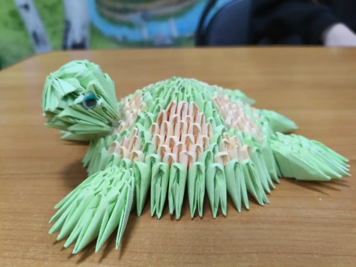 Но особенно популярно модульное оригами — создание объемных картин и поделок. Среди готовых работ парфинских мастериц очень милая зеленая черепашка и семейка мухоморчиков, шикарная дама в нарядном платье и пасхальное яйцо (ну и пусть оно несъедобное, зато очень красивое).