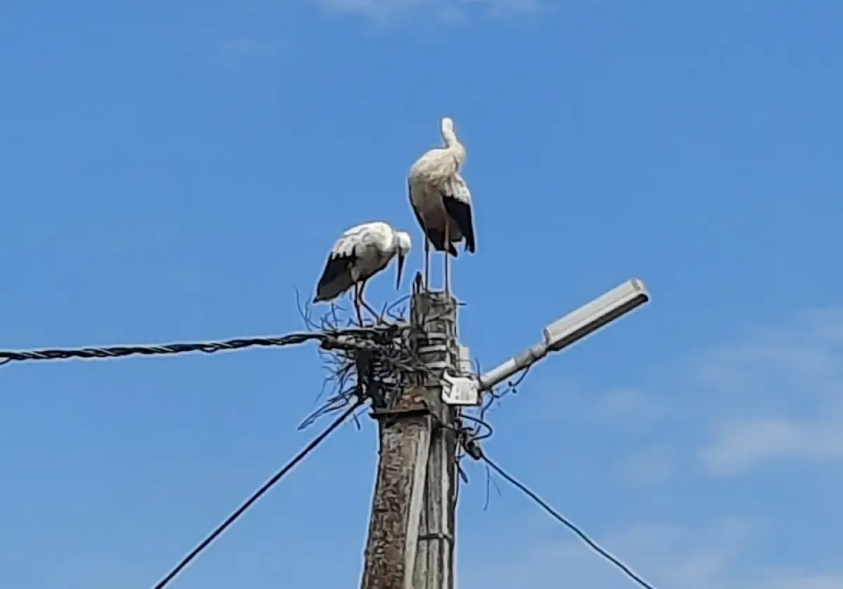Аисты облюбовали еще одно место для будущего гнезда прямо в центре деревни Сергеево Парфинского округа и приступили к строительству своего дома.