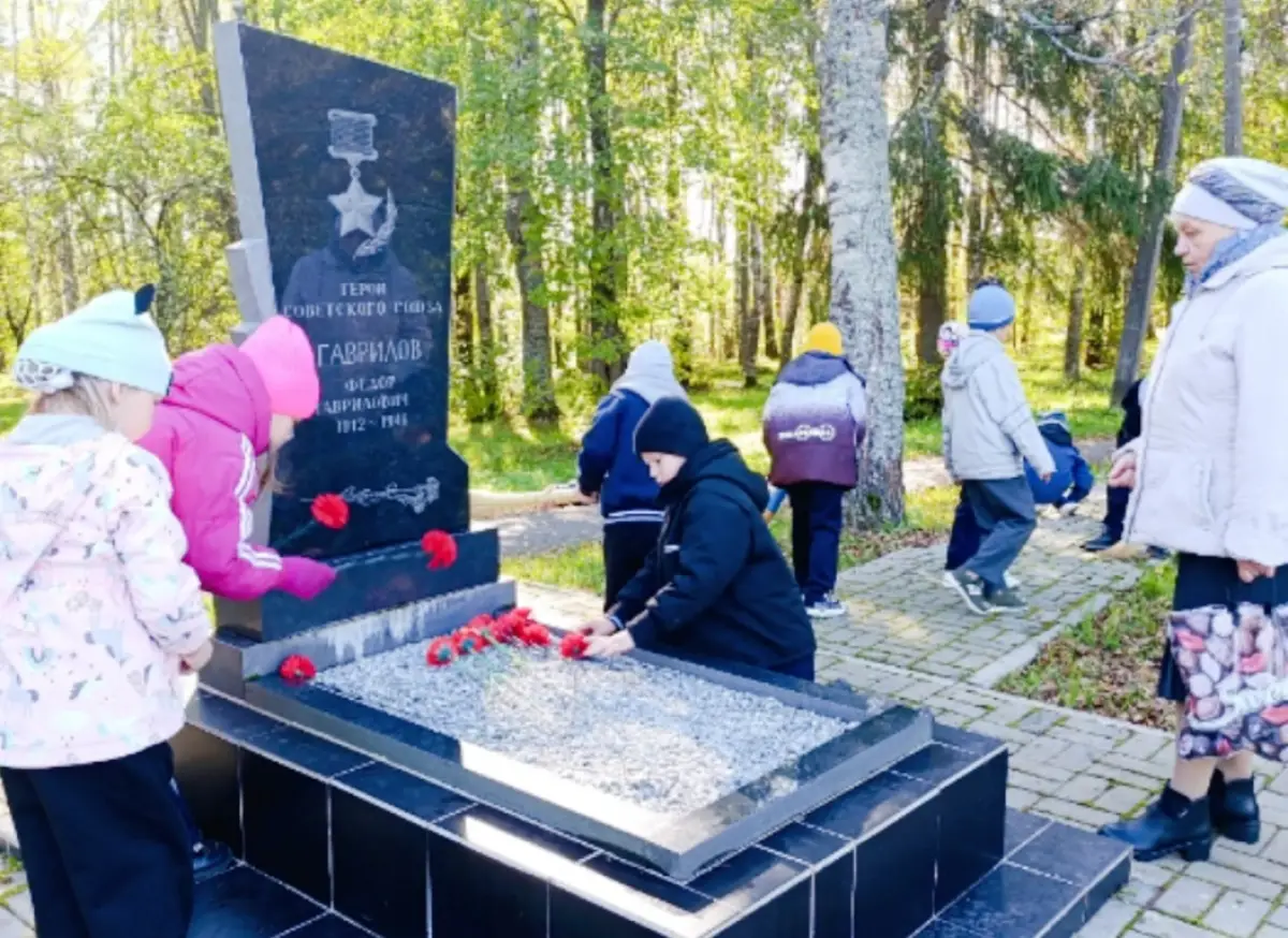 Светлана Михайловна рассказала ребятам о Герое Советского Союза Фёдоре Гавриловиче Гаврилове, который покоится в парке. Дети внимательно слушали рассказ о земляке и его подвигах, а также узнали, что в честь него названа улица в Поддорье.