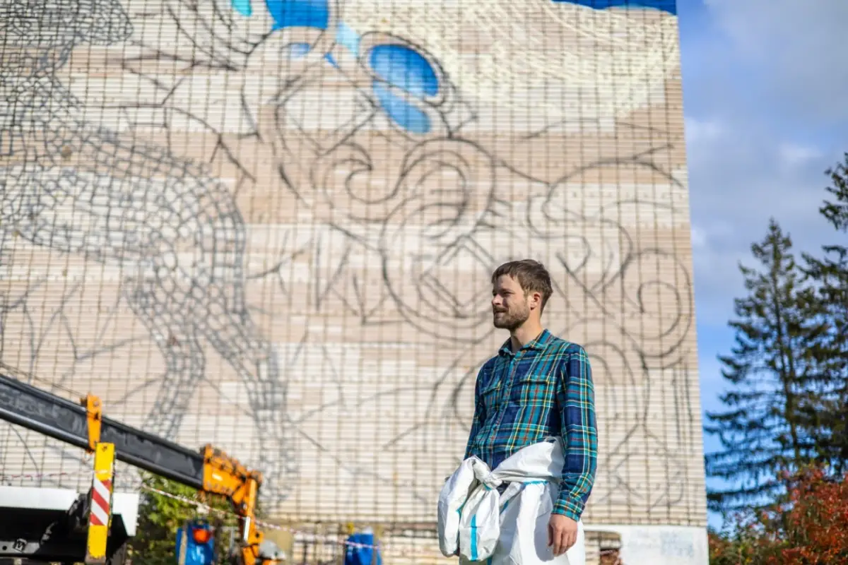 В посёлке Парфино художник из Москвы Алексей Кузнецов работает по адресу: улица Космонавтов, 6А. В прошлом году он создавал мурал в Старой Руссе.