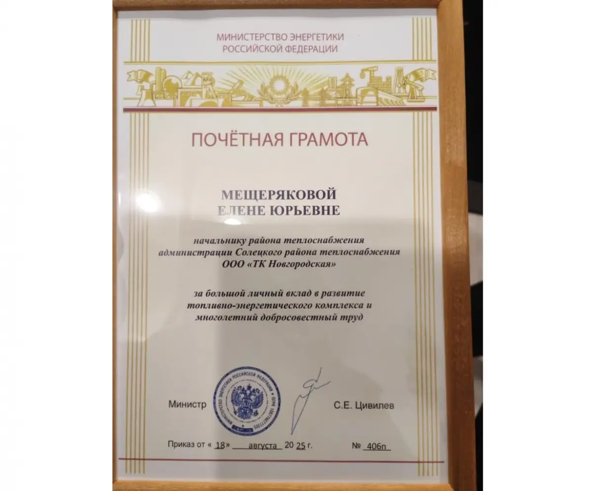 В день юбилея начальнику Солецкого и Чудовского районов теплоснабжения ООО «ТК Новгородская» Елене Мещеряковой вручили Почётную грамоту Министерства энергетики РФ.