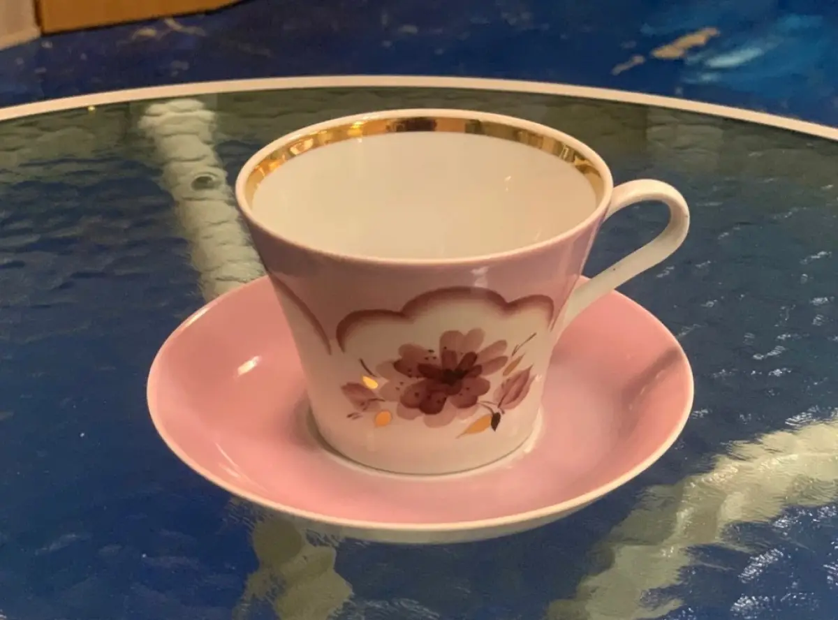 «Примером продукции экспериментального цеха выступает чайная пара из сервиза «Розовый», – продолжал Николай Васильнёв. – Чашка сделана по новой для того времени модели – колокольчик.