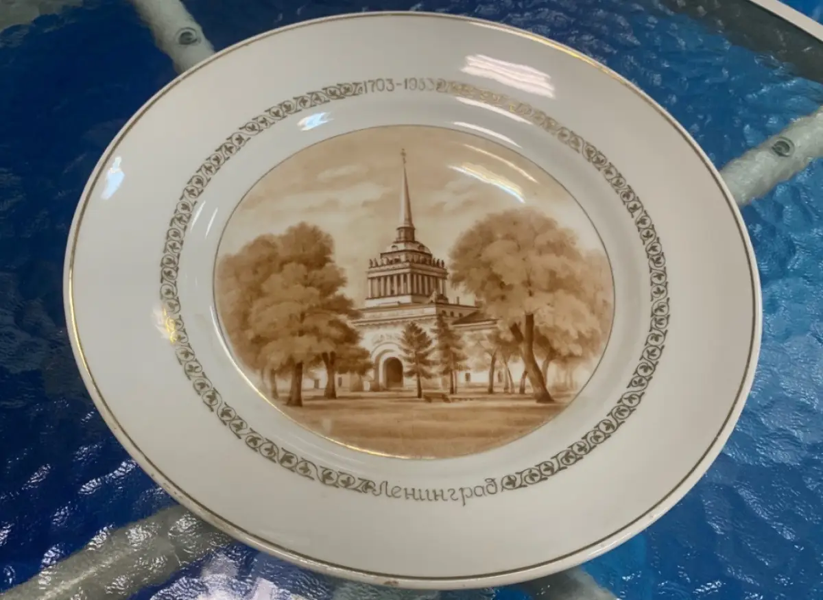 На выставке представлены изделия послевоенного периода. Самые ранние относятся к 1955 году, это декоративные тарелки с видами Москвы и Ленинграда, авторы Иосиф Колонистов и Антонина Горина.