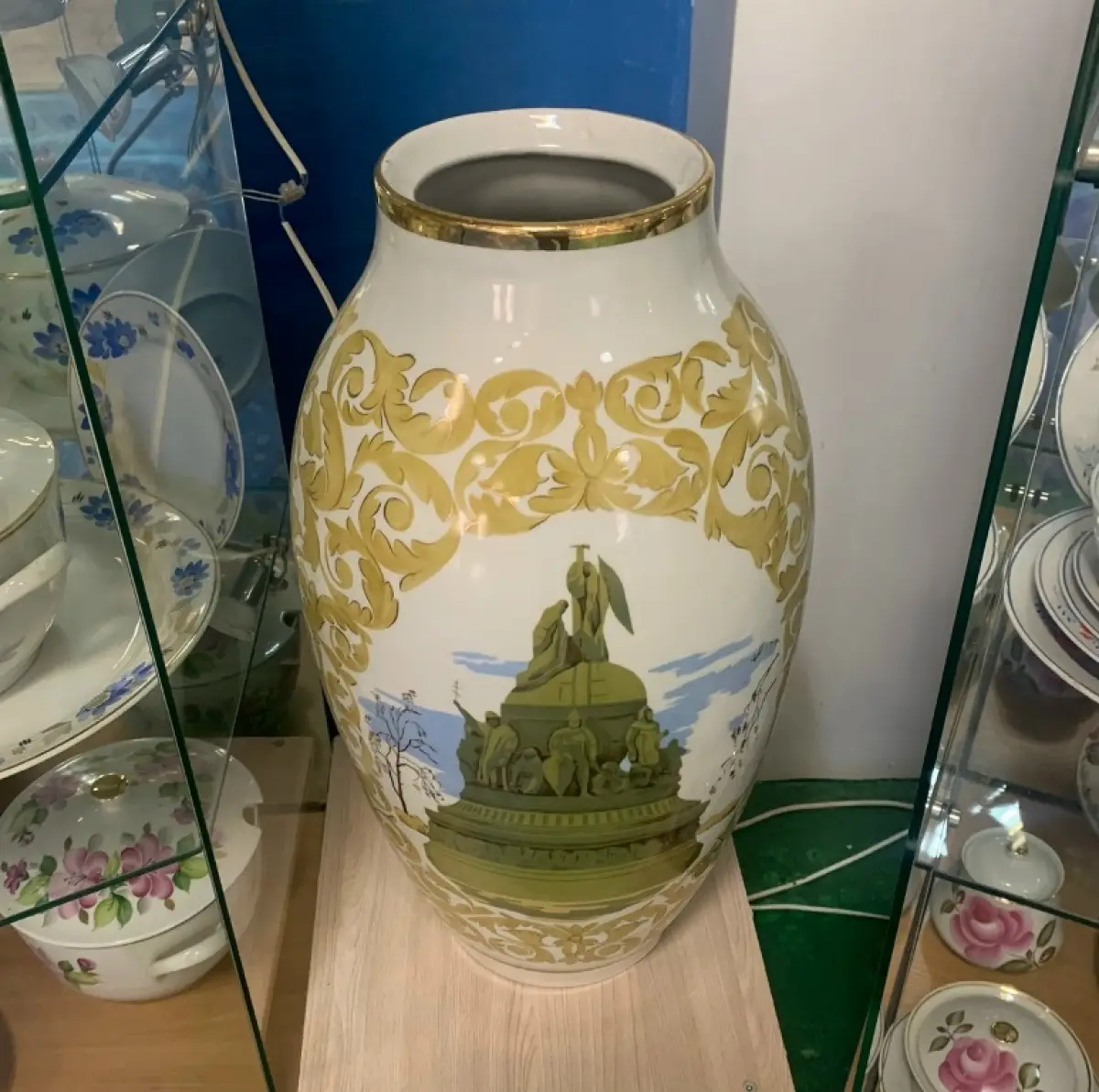 Обратил внимание рассказчик и на большие напольные вазы, они все рисованные, такие редко выпускали. На выставке можно увидеть несколько экземпляров.