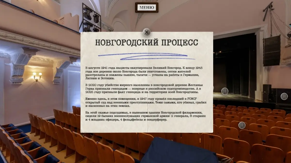 Команда Mash Room сделала полную цифровую панораму зала Новгородской областной филармонии, где в 1947 году проходил суд над нацистскими военными преступниками. Затем команда воссоздала тот исторический процесс, рассказав о преступлениях нацистов, допросах обвиняемых и выступлениях свидетелей.