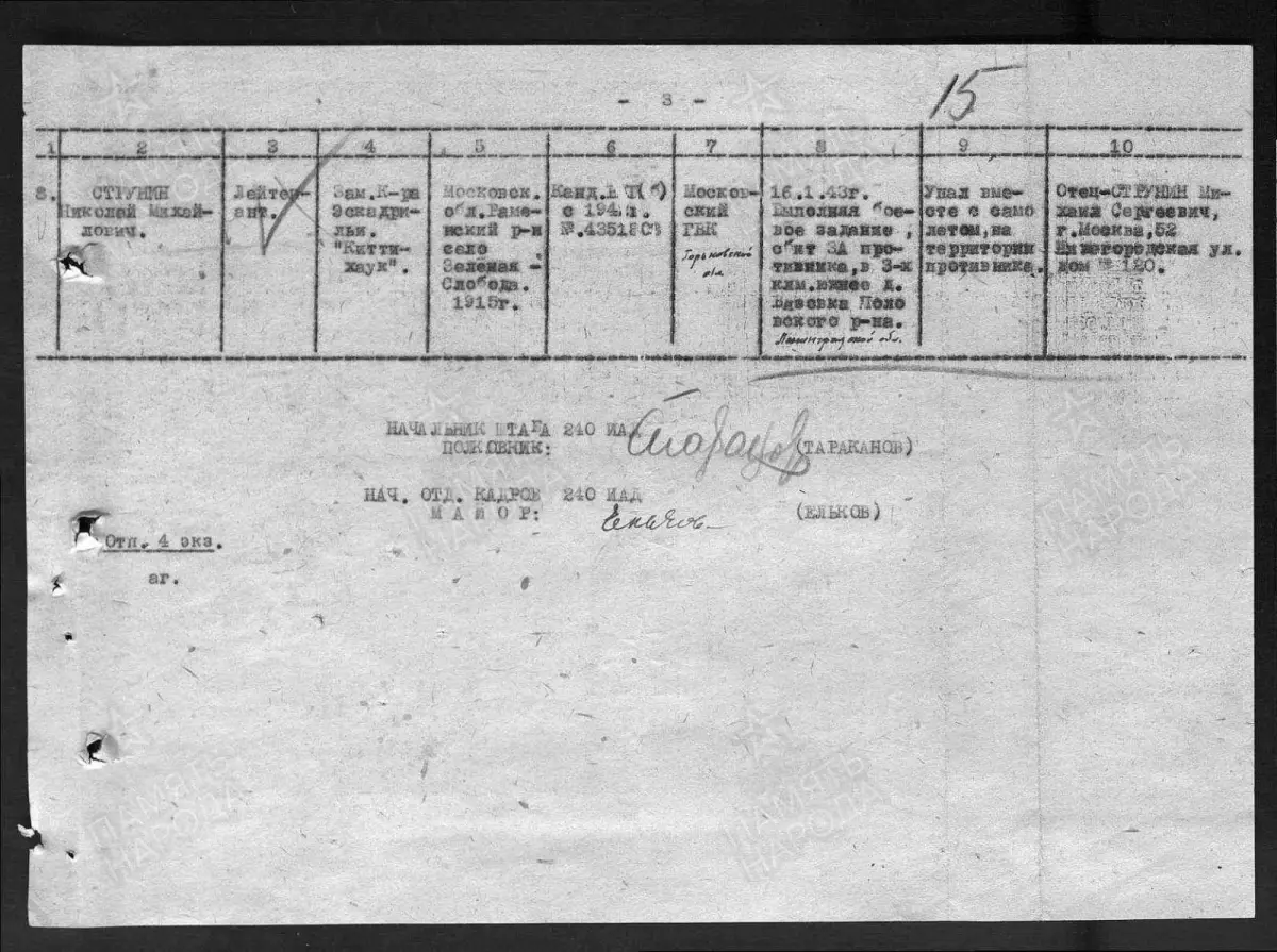 6 января 1943 года истребитель Р-40 «Киттихаук» №1752 с мотором V-1710-39 №10625 не вернулся с боевого задания из района Савкино, Федорово. Сбит зенитной артиллерией в районе Вязовка заместитель командира эскадрильи 46-го Истребительного авиационного полка 240-й Истребительной авиационной дивизии лейтенант Николай Михайлович Струнин.