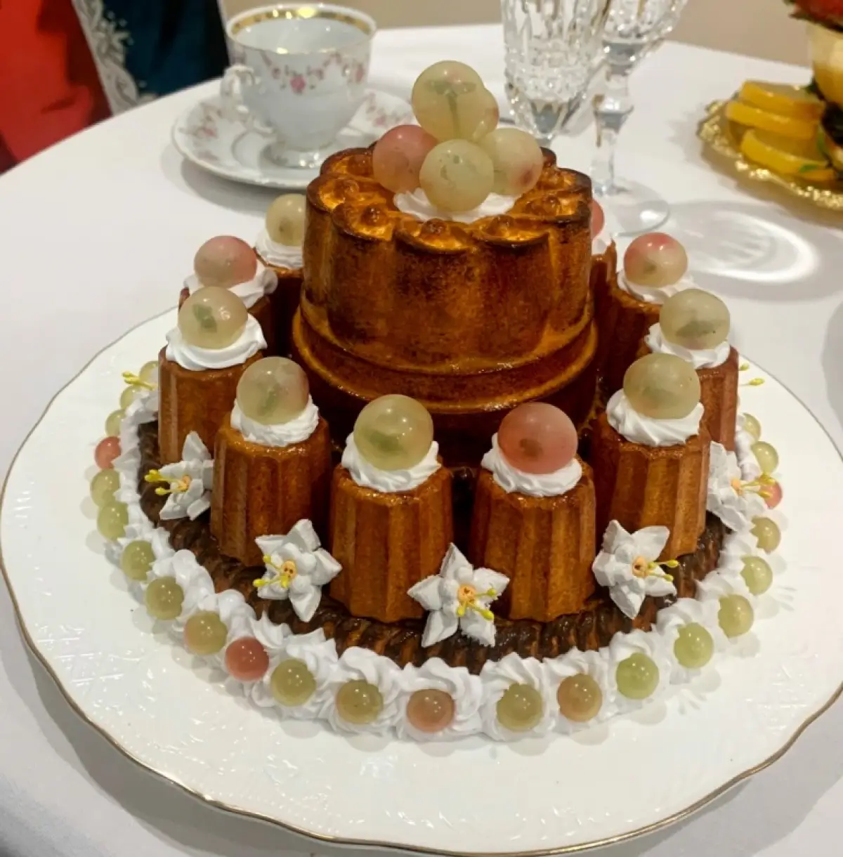 Рядом помещено ещё одно любимое императорское блюдо, на сей раз династии Габсбургов – «Бискуить Виена». Он украшен кремом из персиков, земляной мускусной ягодой и цветами из сахарного фарфора.