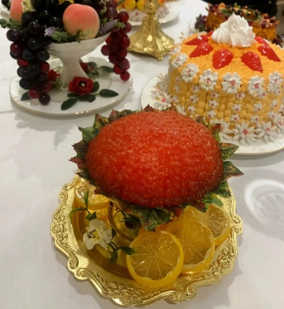 Исторические сведения и вдохновили известного кондитера-историка Алдиса Бичевса на очередное творение, только уже на новгородской земле. Он предложил накрыть парадный стол, изготовив муляжи изысканных блюд, что могла отведать императрица в путешествии. Ранее у мастера были выставки-реконструкции «Царский пир в Коломенском» в Подмосковье и «Парадный обед в усадьбе К. Н. Батюшкова» в Вологодской области, а ещё множество шоколадных творений.