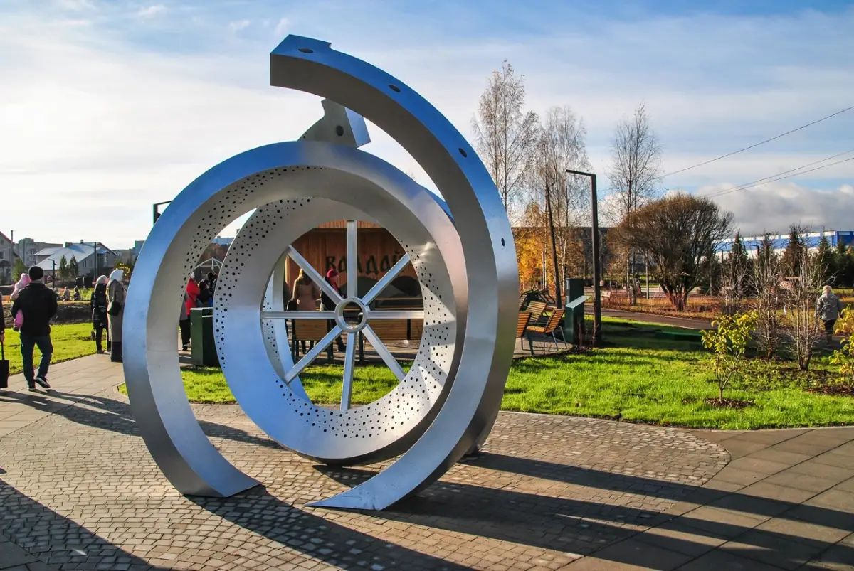 Возле входа посетителей встречает арт-объект, дополненный подсветкой. Его форма — собирательный образ ремёсел Валдая. Колесо в основе композиции напоминает о временах ямщиков и ткацком ремесле, а также о творчестве и созидании, ведь с разных точек силуэт раскрывается по-новому.