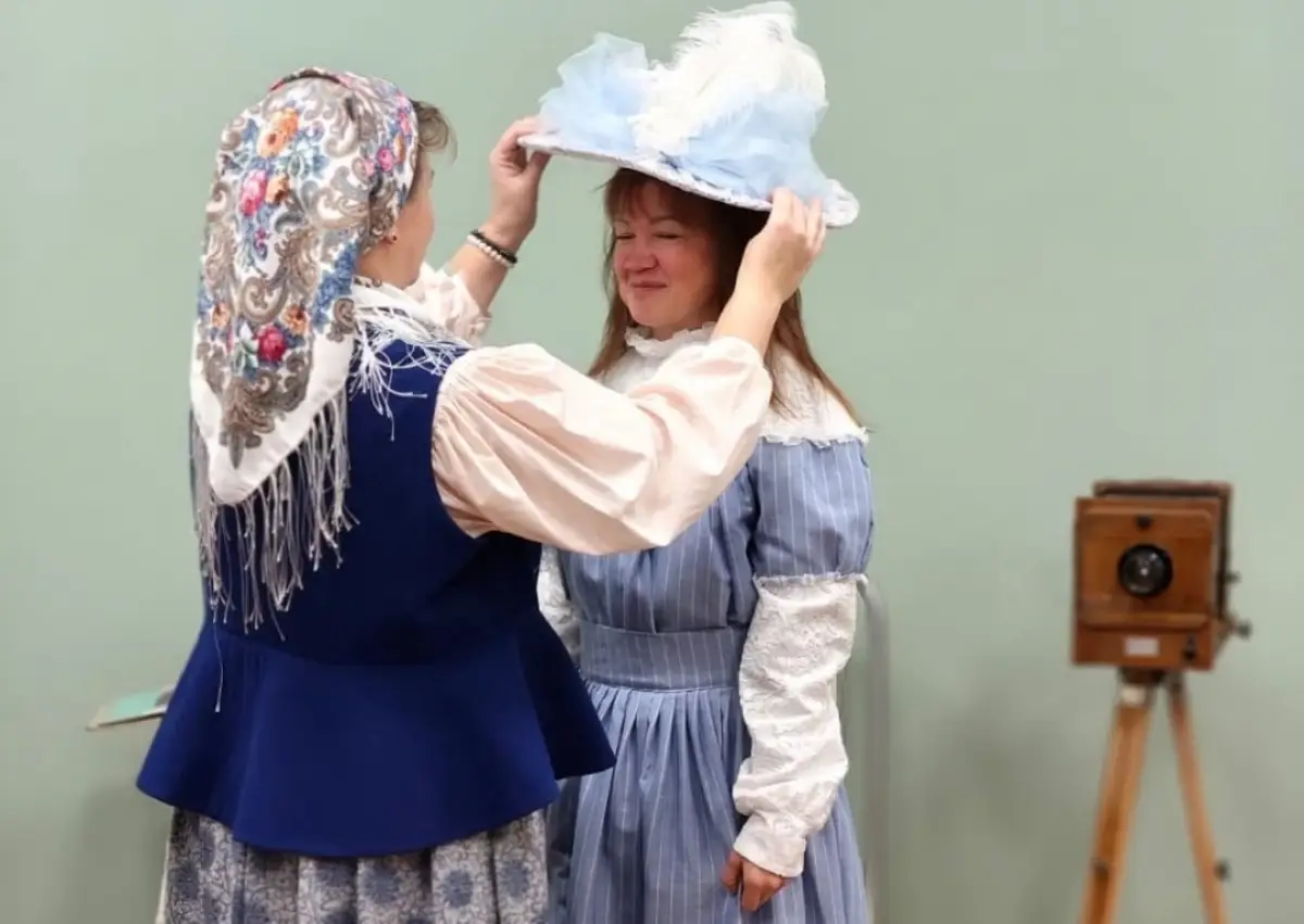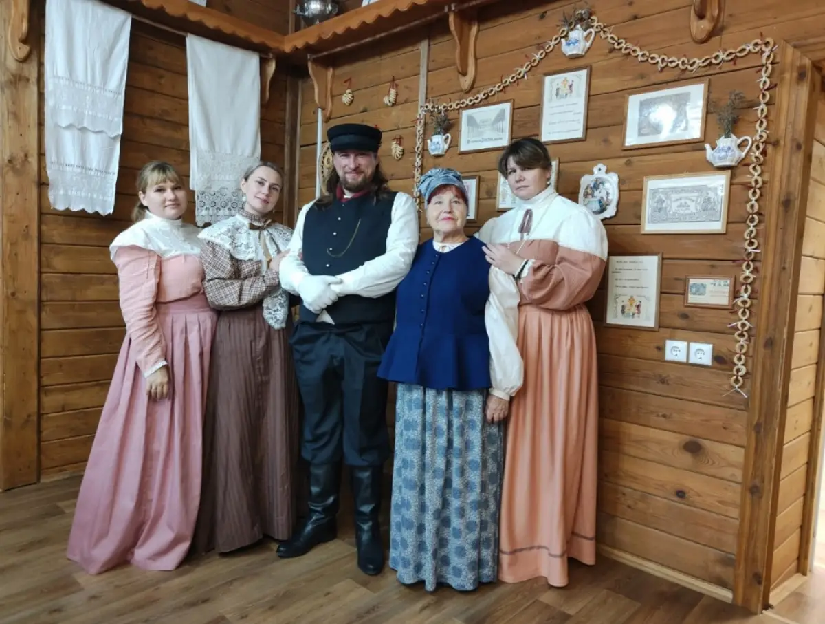 Фото на память в чудесной фотозоне в образе членов купеческой семьи - и гости перемещаются из выставочного зала в зал Крестецкой строчки. Здесь их встречает средняя дочь Иванченковых Мария Григорьевна – девушка 25 лет, более строгая и серьёзная, чем младшая сестрица, но так искренне радующаяся добрым людям, с которыми можно поболтать.