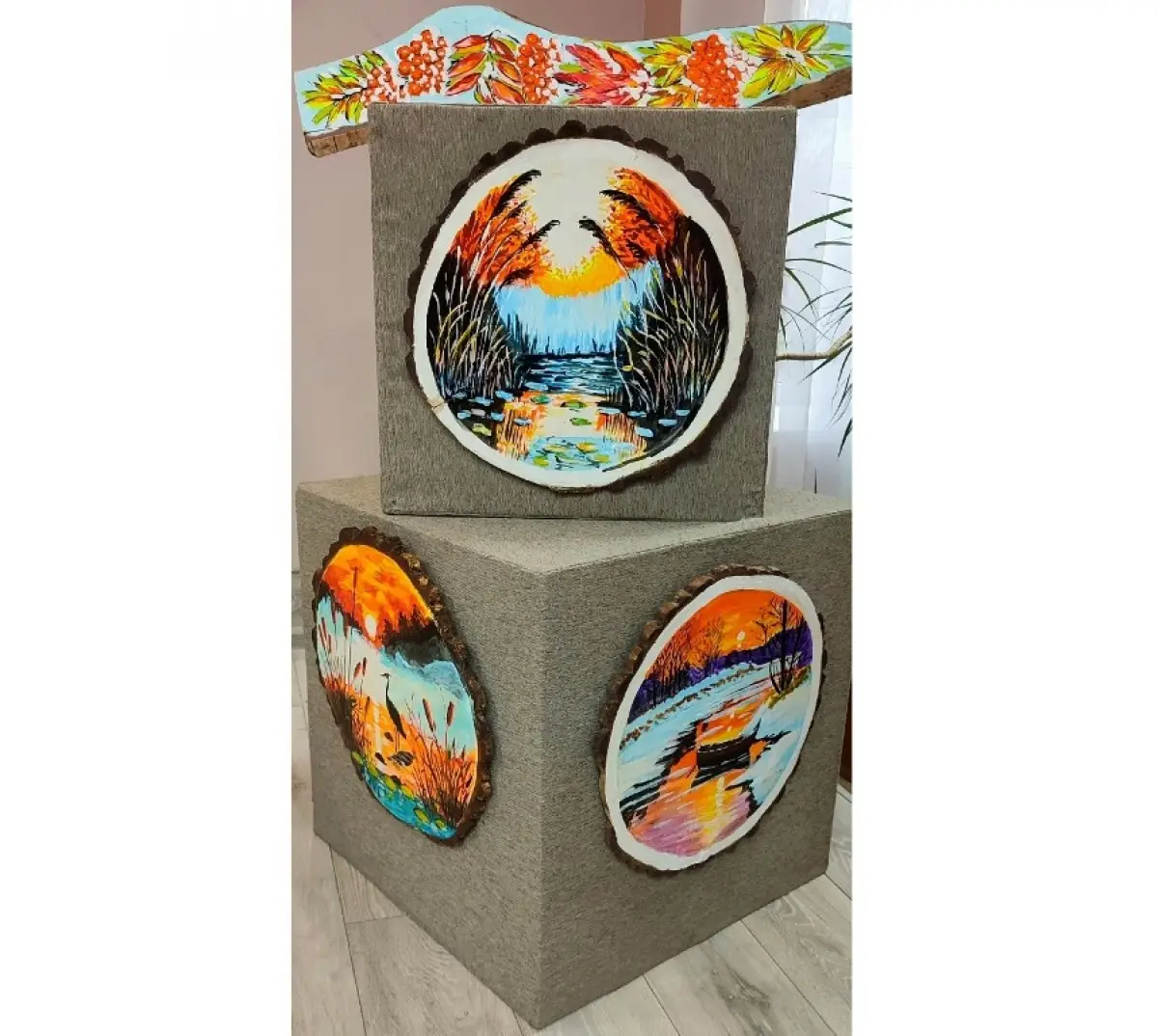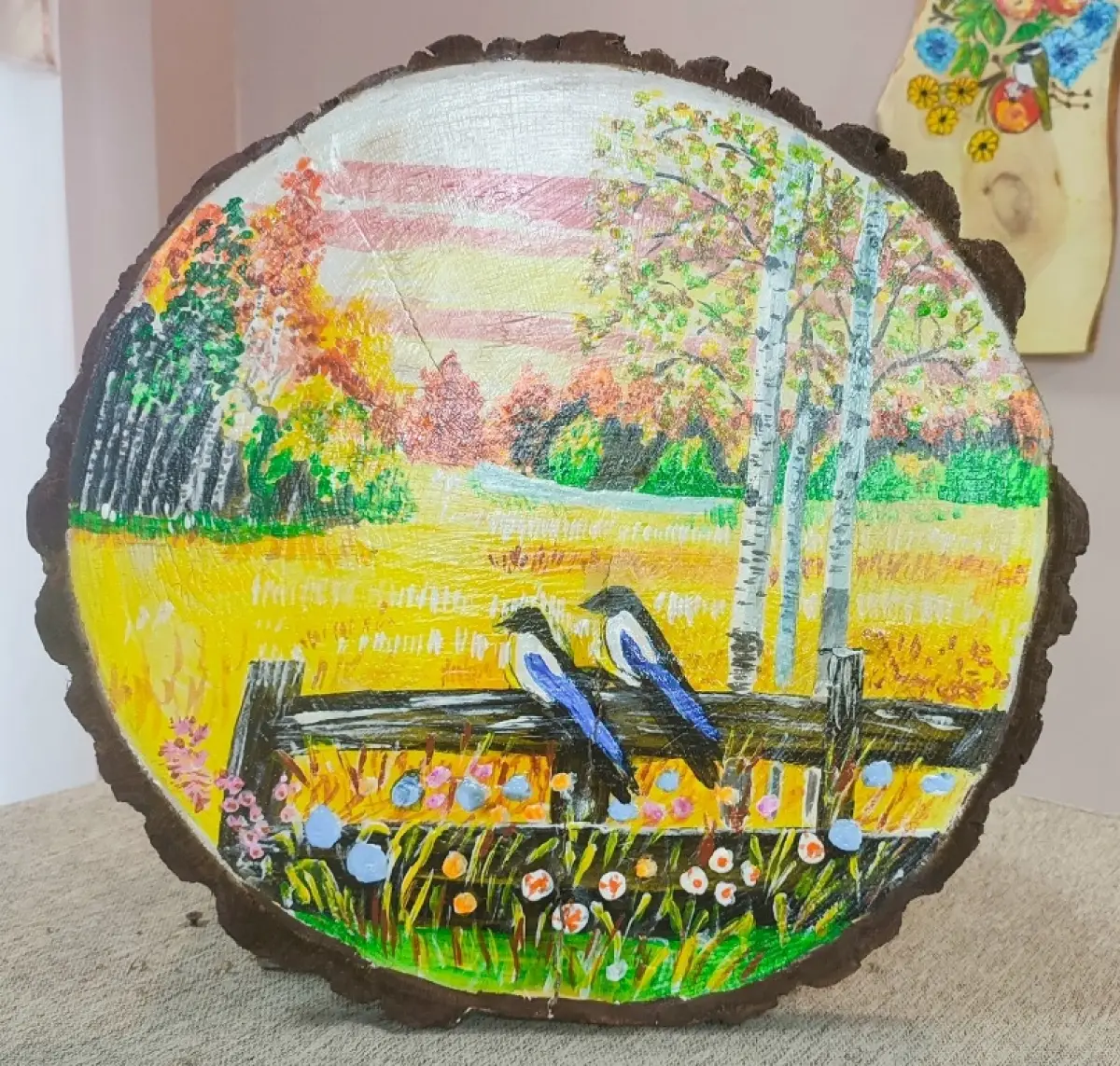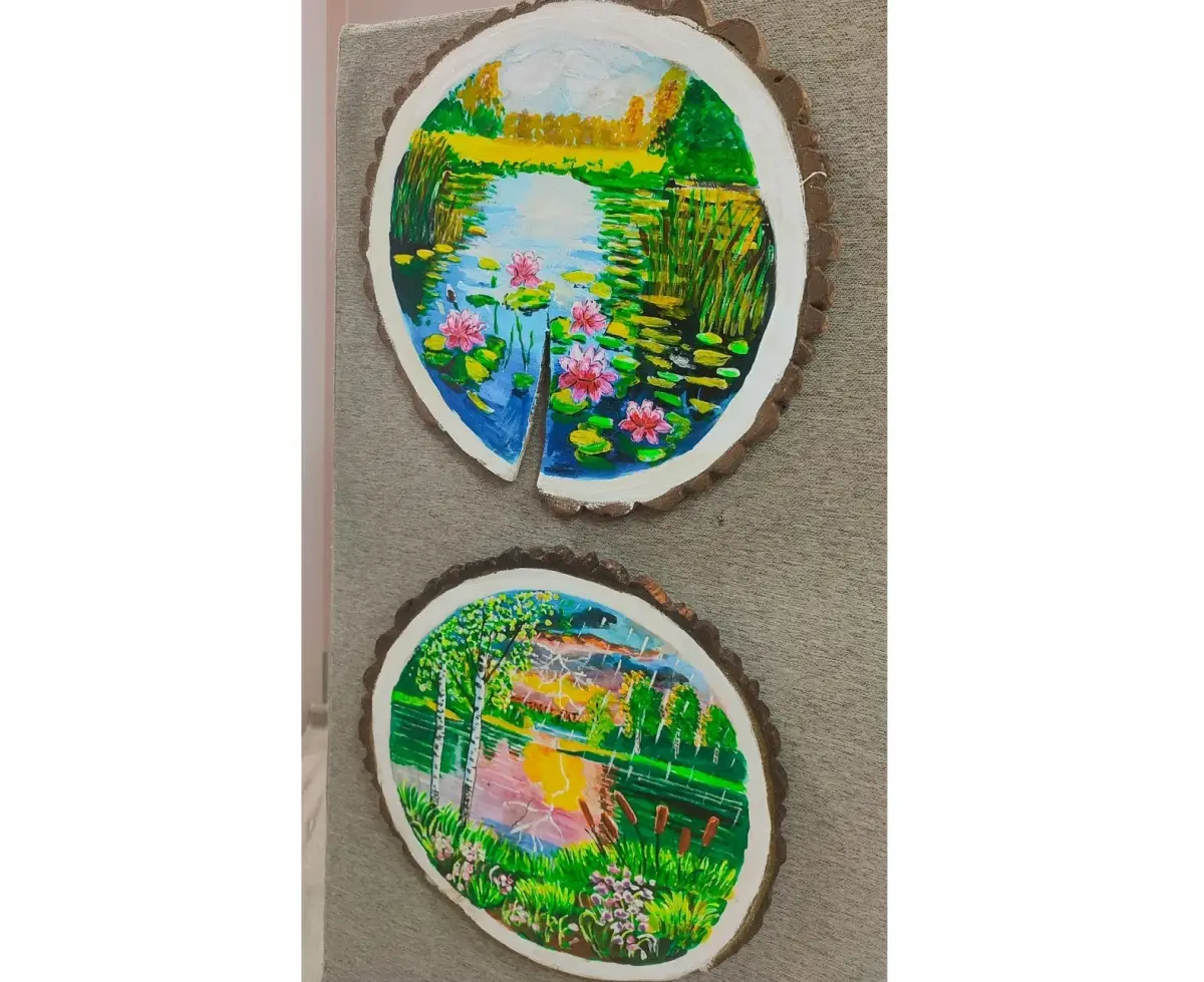 «Сын Серёжка работает на пилораме, вот я его и попросила сделать спилы, – объясняет мастерица. – Кругляши хороши, только дают трещины, правда, с ними даже интереснее, живее смотрится. Меня привлекает этот материал ещё и потому, что не надо изготовлять рамы, ободок делает само дерево. В основном это ель, крепкое дерево, трещин практически не бывает. Мне нравится работать с разными формами».