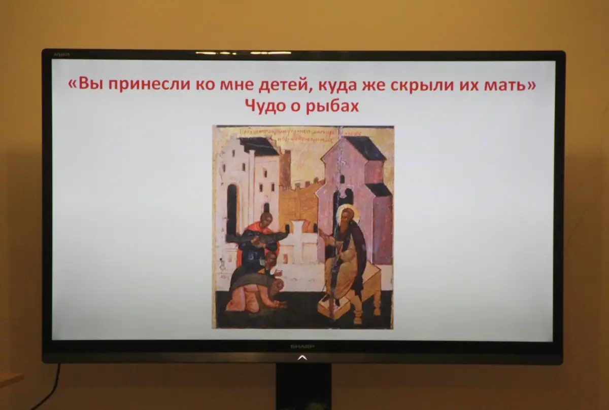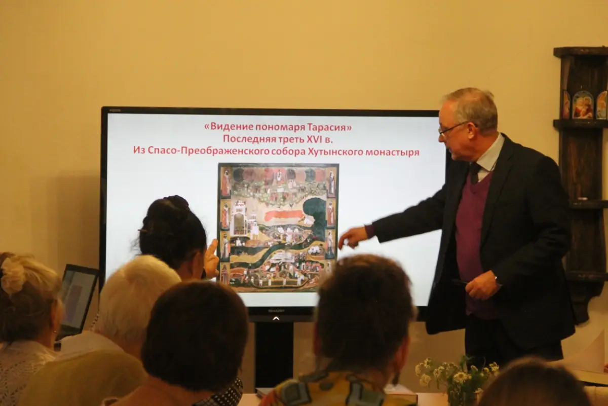 Встреча началась с просмотра уникального фильма Заслуженного деятеля искусств РСФСР Эдуарда Васильевича Раненко, посвященного знаменитой иконе «Видение пономаря Тарасия».