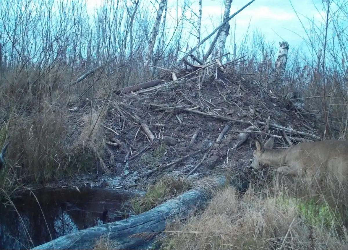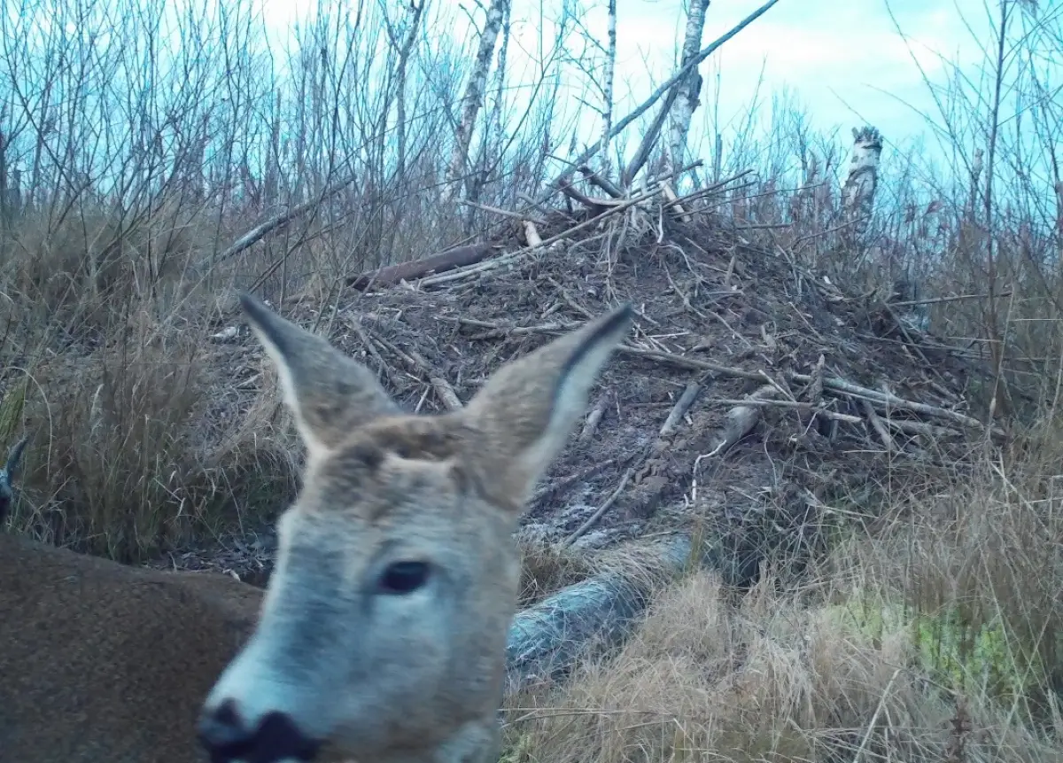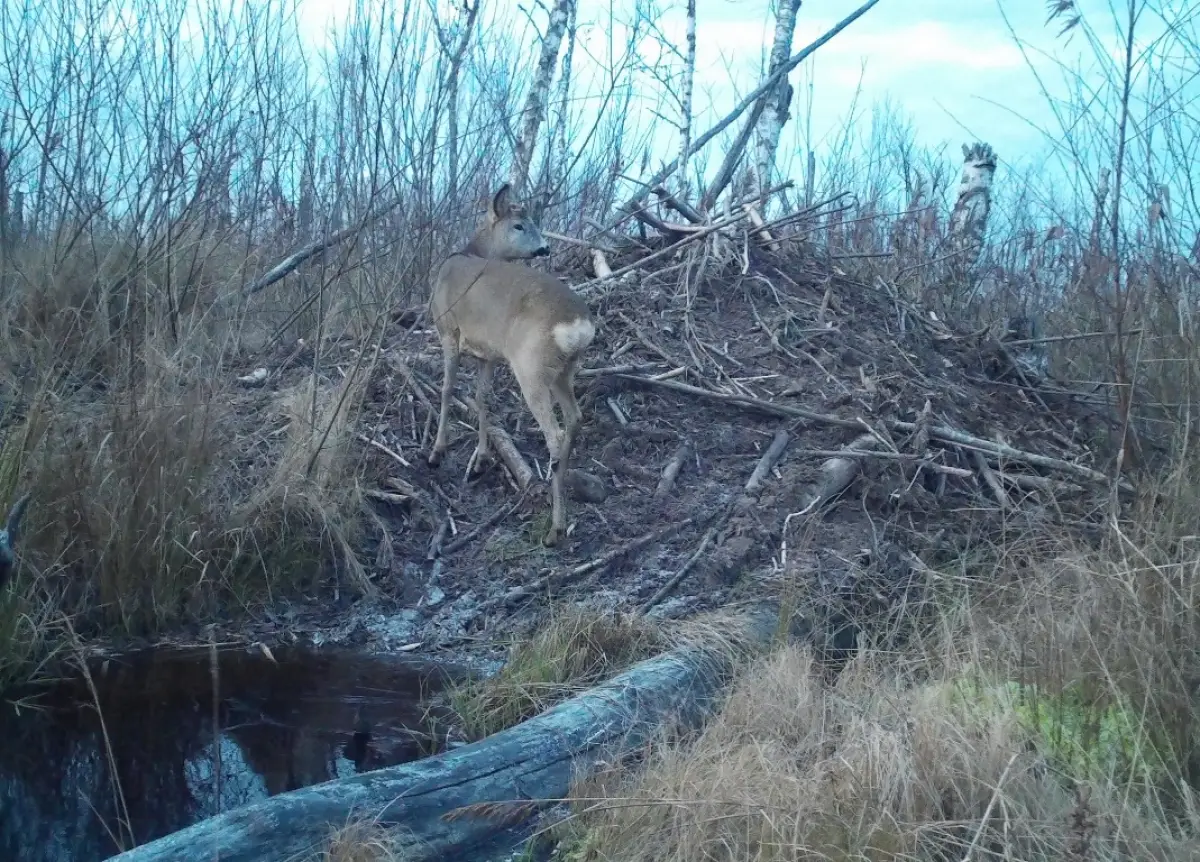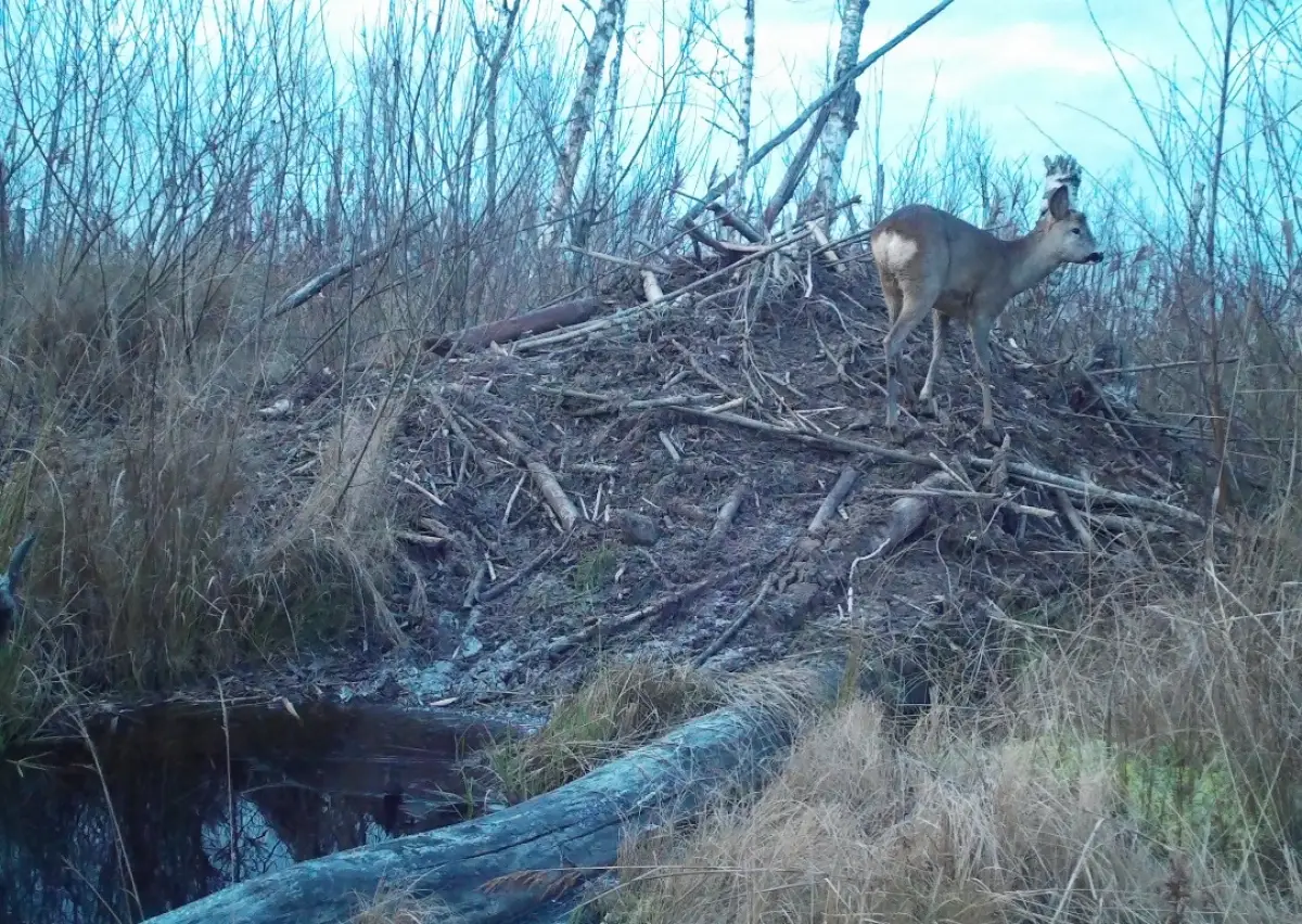 16 ноября на одной из бобровых хаток отметилась неожиданная гостья – европейская косуля. Фотоловушка запечатлела взрослую самку бродящей по крыше бобровой хатки.