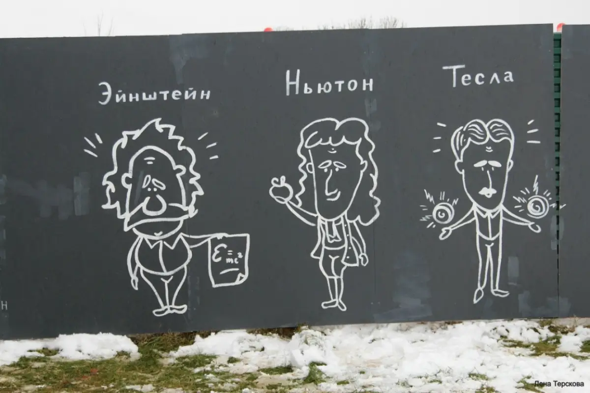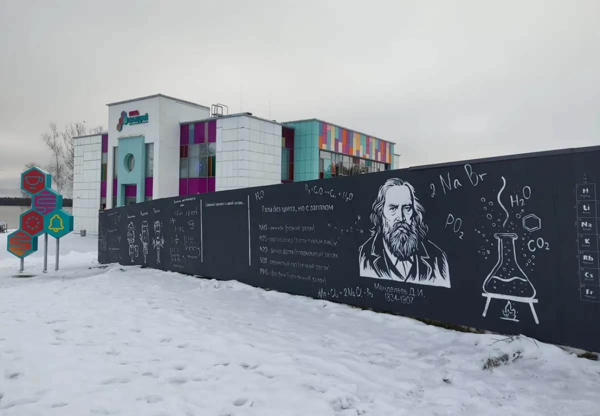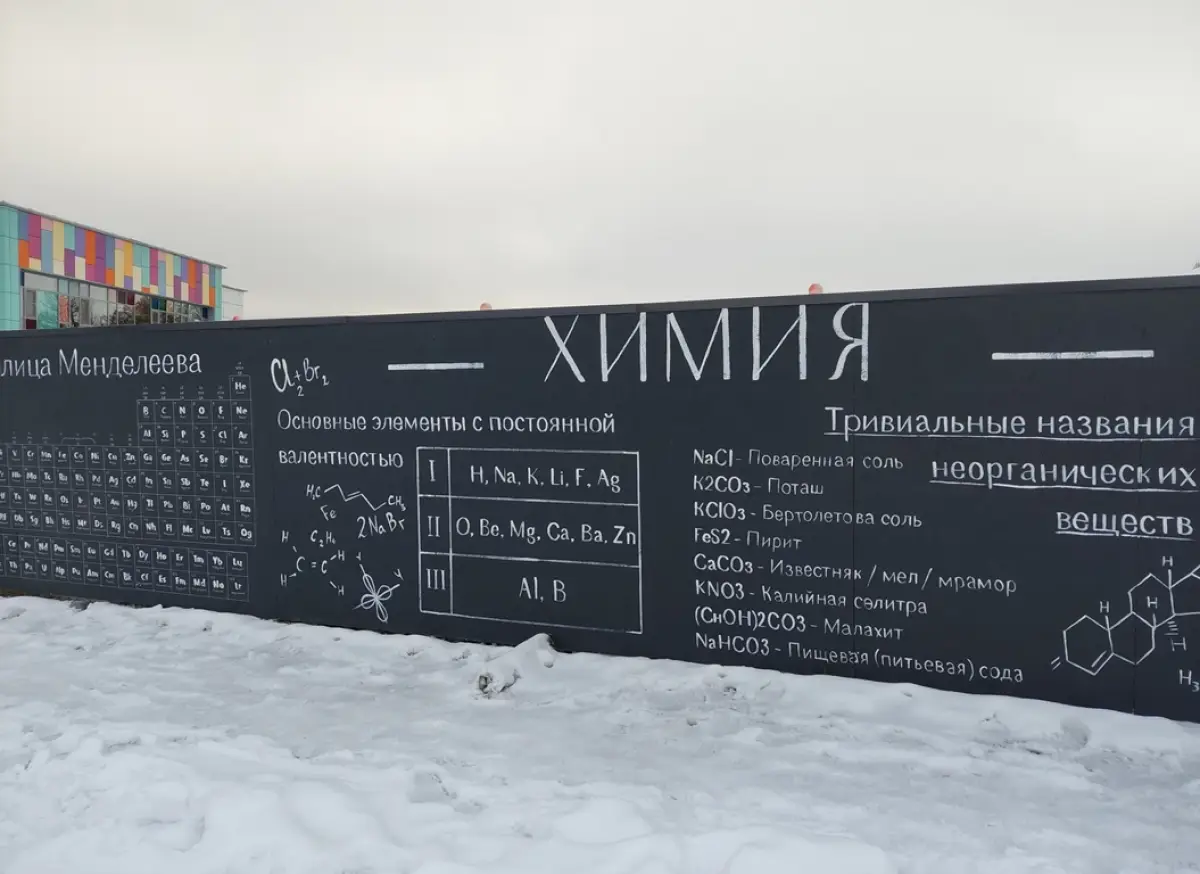 Он выполнен в стилистике школьной доски, на которой «мелом» нанесены физические и химические формулы, исторические даты и ещё многое из того, чему учат в школе. Теперь у ребятишек, спешащих на «Поляну сказок» или в «Место.Валдай», появилась прекрасная возможность «закрепить» пройденный в школе материал или узнать что-то новое.