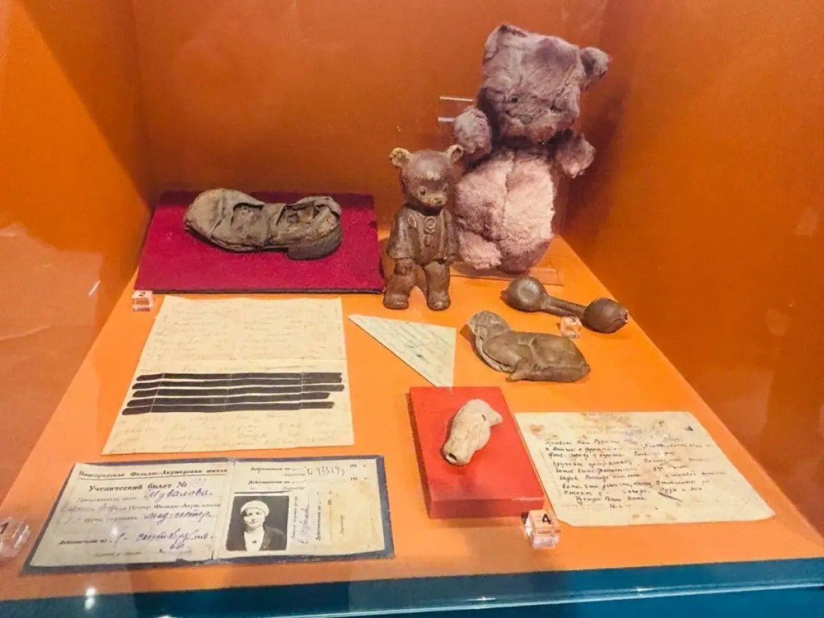 – резиновая игрушка «Медвежонок». 1930-1940-е годы. Найдена около железнодорожной станции Лычково на месте трагедии ленинградских детей;