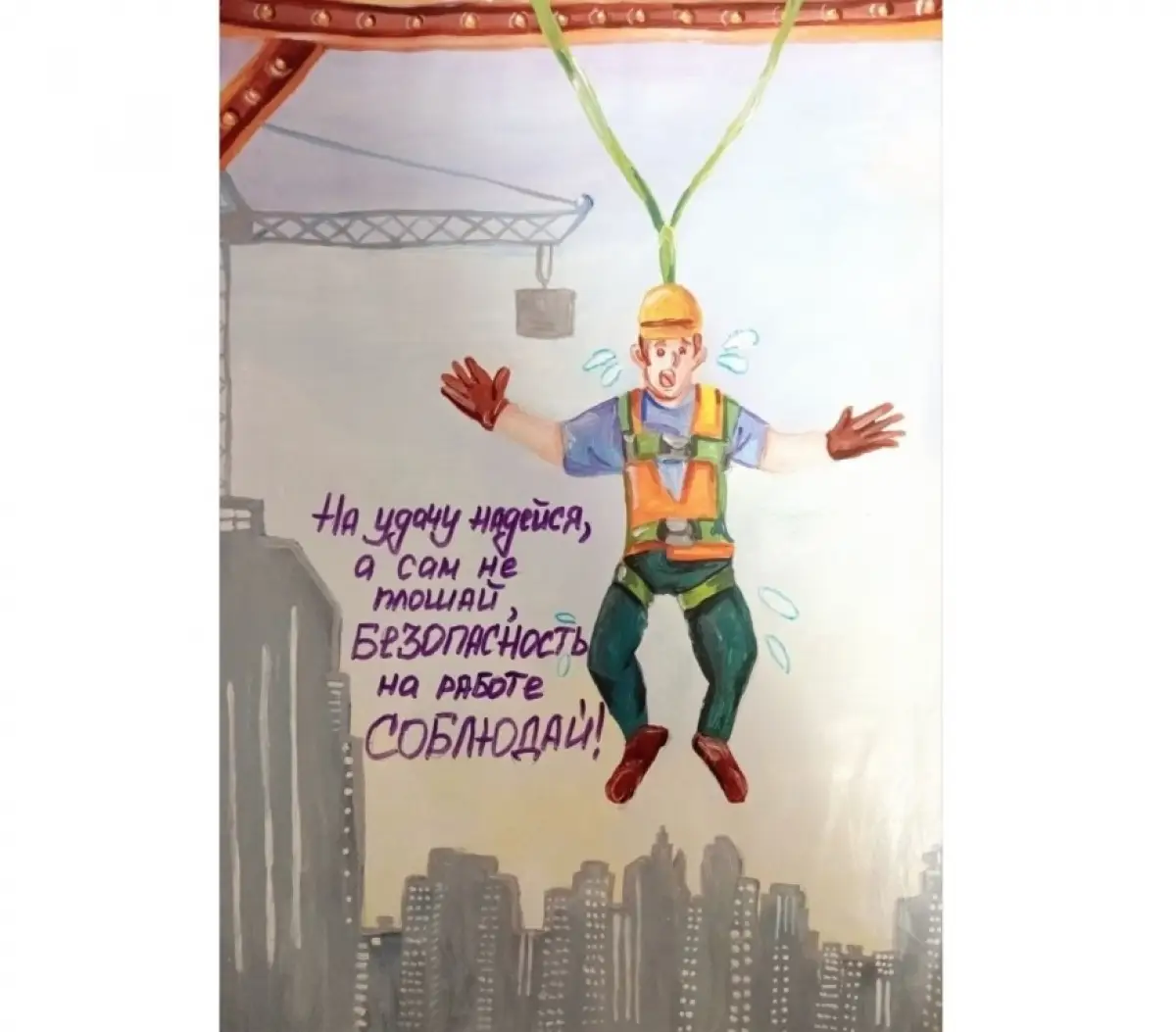 Тема сохранения здоровья и жизни отражена в работе победителя областного конкурса детского рисунка «Охрана труда глазами детей-2025» ученицы школы посёлка Парфино Марии Михайловой.