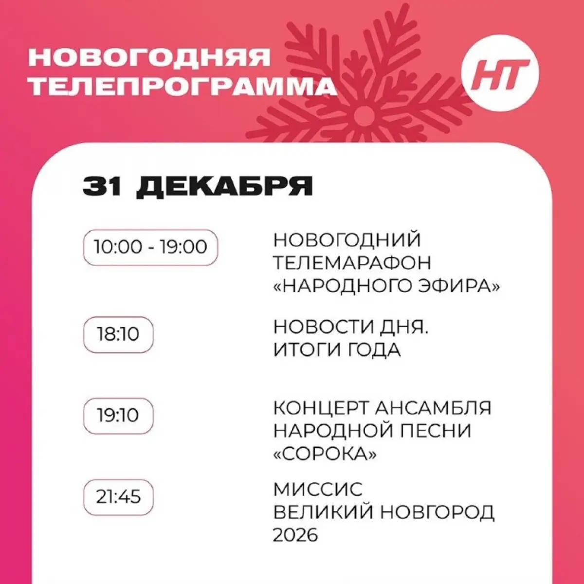 Ну а к праздничному застолью, в 21:45, НТ приступит максимально красиво. В эфир выйдет телеверсия финала конкурса «Миссис Великий Новгород 2026».