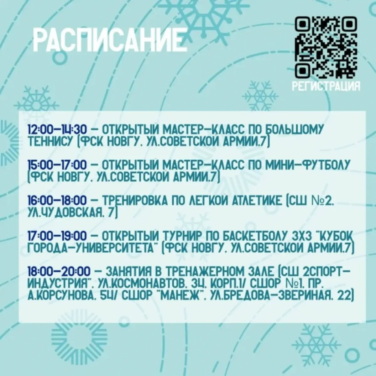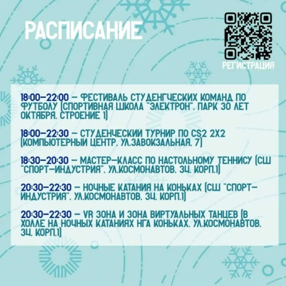 Также нужно заранее выбрать площадку и пройти регистрацию по ссылке или QR-коду на афише.