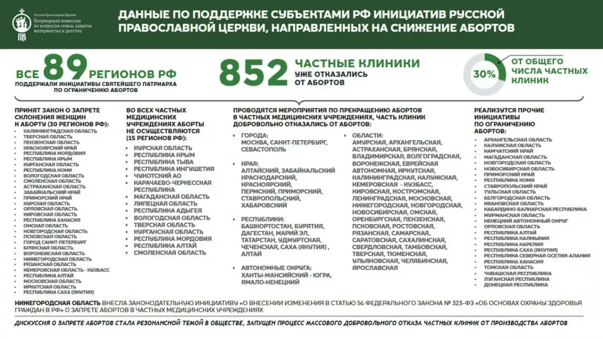 В настоящее время все 89 регионов страны поддержали инициативы Патриарха Московского и всея Руси Кирилла по ограничению абортов.
