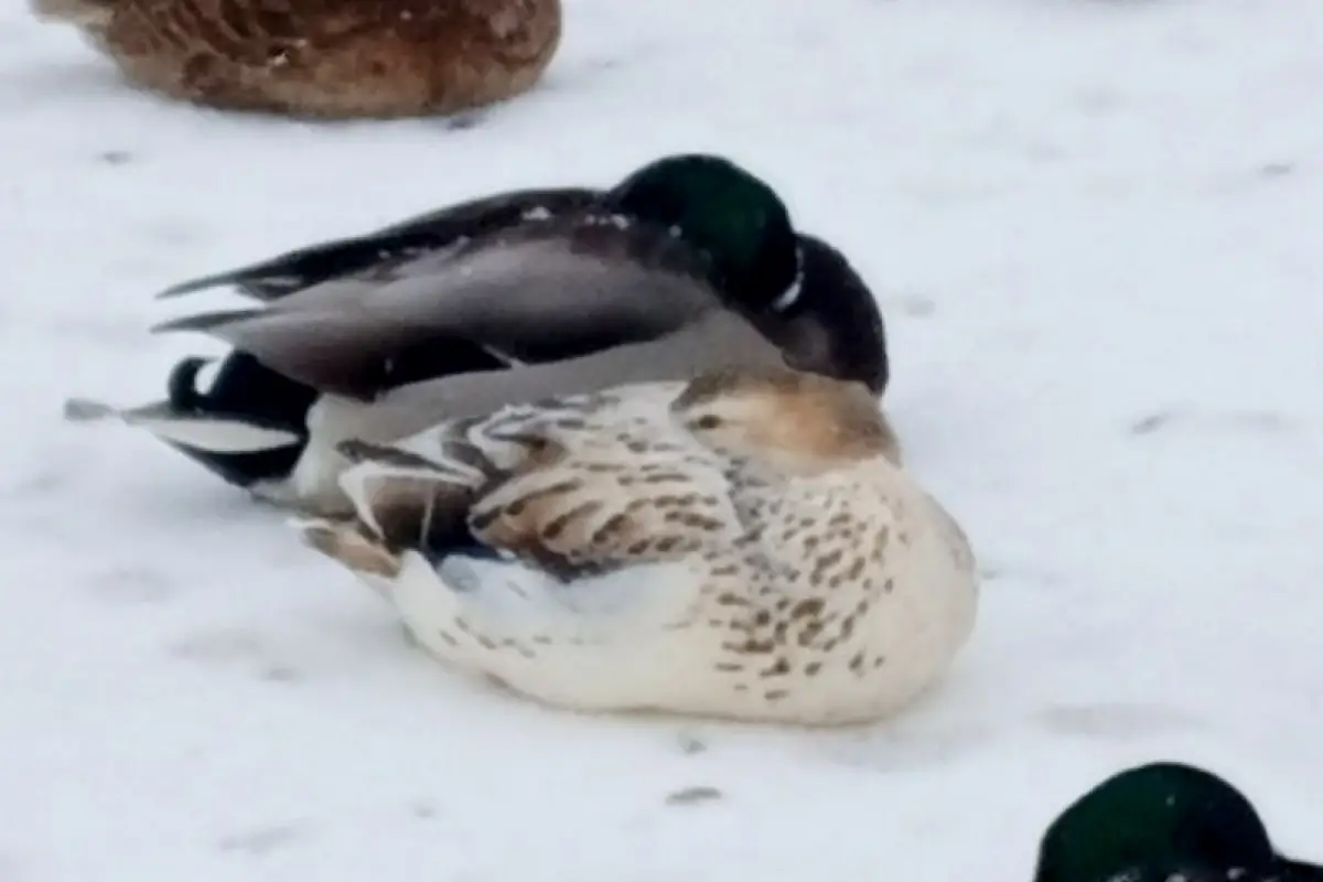 На втором фото, скорее всего, лейцистическая утка с частичной потерей пигментации.