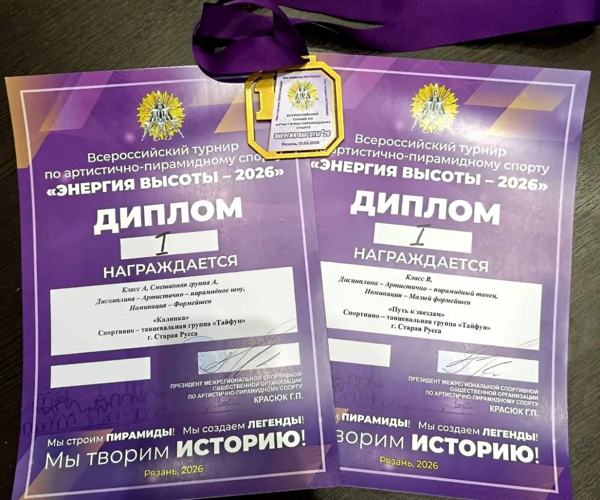 Юные гимнастки из спортивно-танцевальной группы «Тайфун» спортшколы города Старая Русса завоевали два первых места в дисциплине «Артистично-пирамидное шоу». Они выиграли в номинациях «Формейшен» (номер «Калинка») и «Малый формейшен» (номер «Путь к звёздам»).