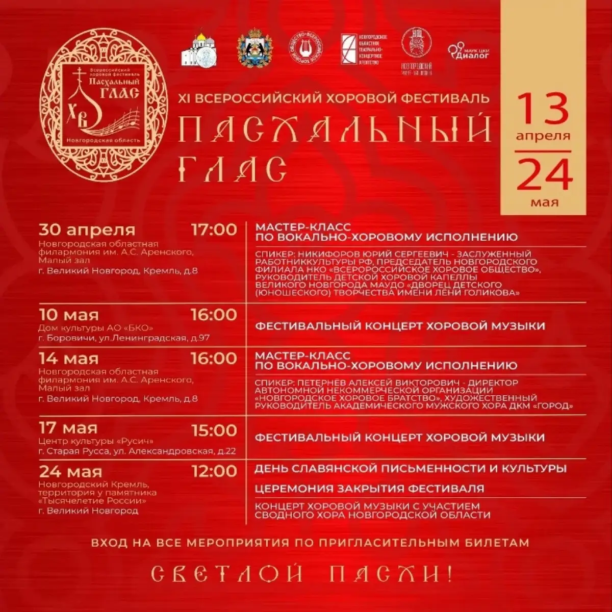 24 мая, в День славянской письменности и культуры, в День памяти святых равноапостольных братьев Кирилла и Мефодия, в Новгородском кремле у памятника Тысячелетию России по традиции пройдет торжественное закрытие XI Всероссийского хорового фестиваля «Пасхальный глас» гала-концертом с участием сводного хора Великого Новгорода. Это яркое событие начнётся в полдень.