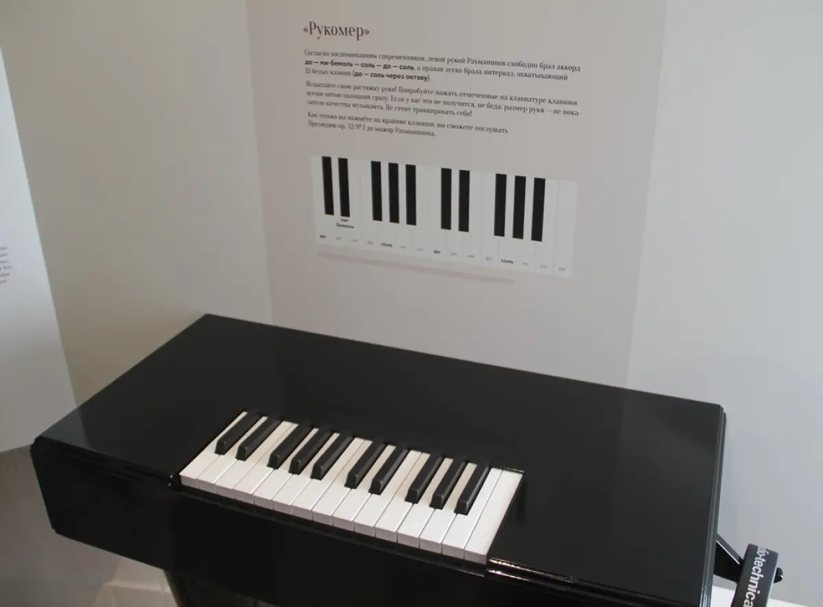 Или, например, с помощью «рукомера» сравнить размах пальцев своей руки с рахманиновским. Невероятно, но он достигал более 30 сантиметров! Это позволяло Сергею Васильевичу охватывать до 13 клавиш на фортепиано одной рукой.