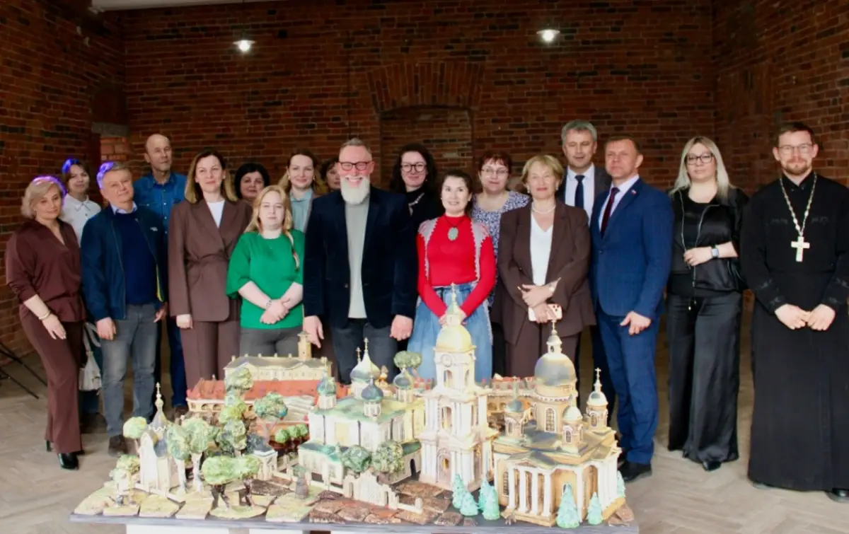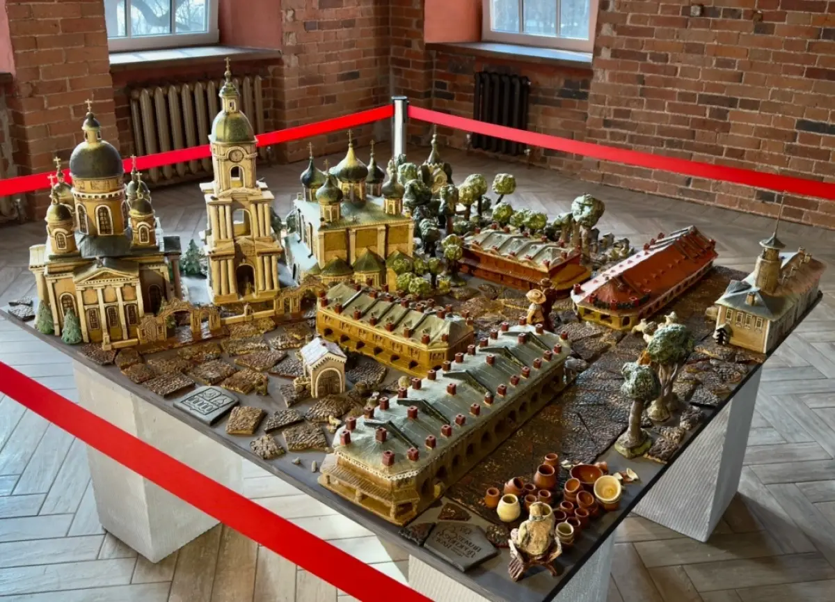 В усадьбе Неклюдова представили объёмный макет Соборной площади старинных Боровичей. Модель выполнили из местных глин мастера Мстинской гончарни.