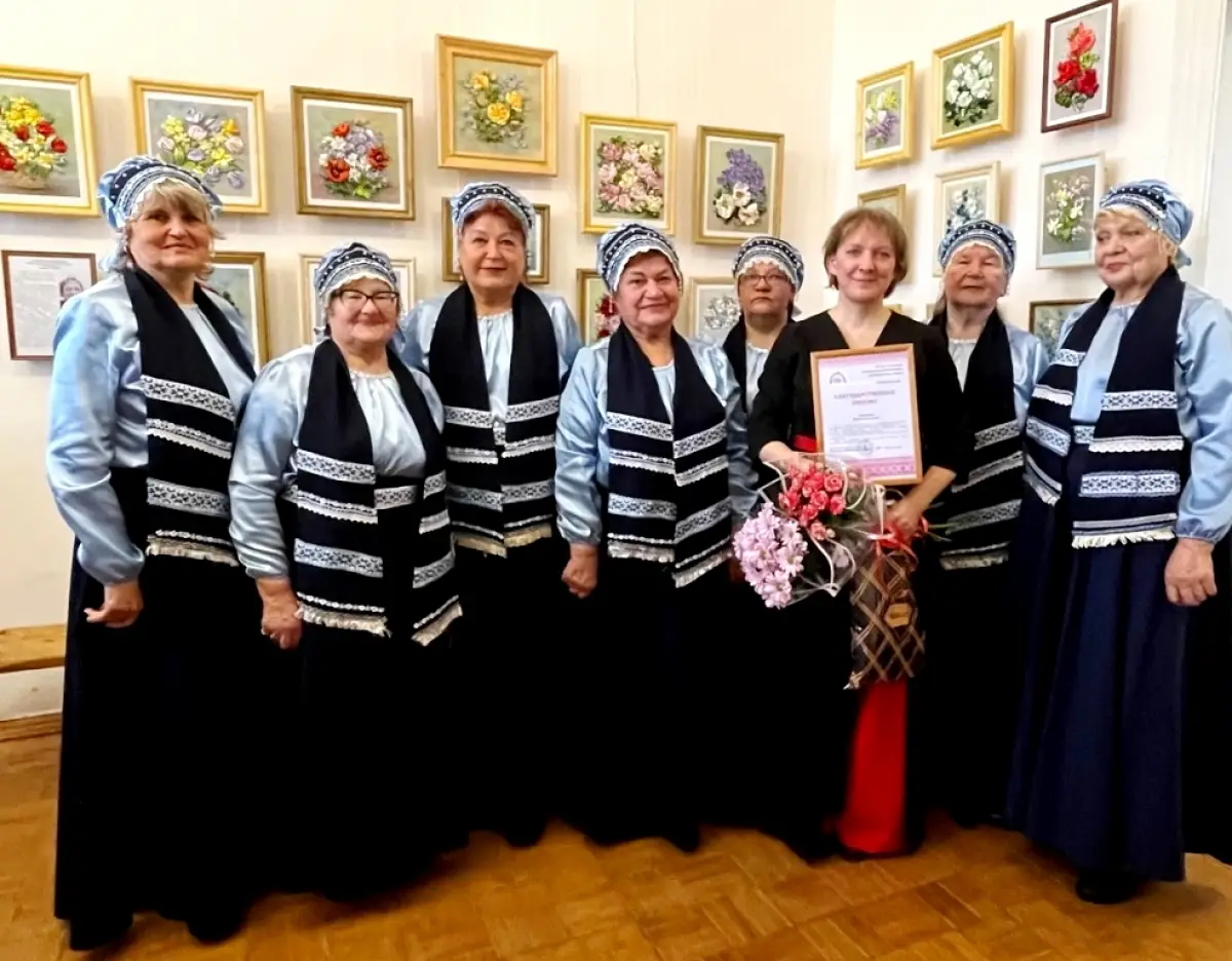 Юлия Георгиевна — яркий и интересный человек, многогранная мастерица, внимательный педагог. Она увлекается не только вышивкой атласными лентами, но и ткачеством. А ещё она руководит хором ветеранов «Надежда», который приехал вместе с ней и украсил вечер своим пением.