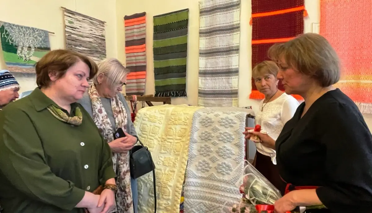 На выставке представлены вышитые лентами картины и мастерски сотканные палантины, панно, дорожки и коврики.